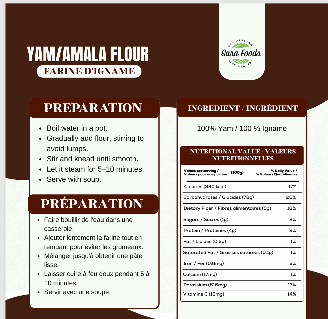 Découvrez le goût riche et traditionnel de la farine d'igname/Amala , élaborée à partir d'ignames soigneusement sélectionnées pour un repas onctueux et nutritif. Notre farine premium est 100 % naturelle , sans additifs et traitée pour préserver son goût authentique et ses bienfaits pour la santé.
